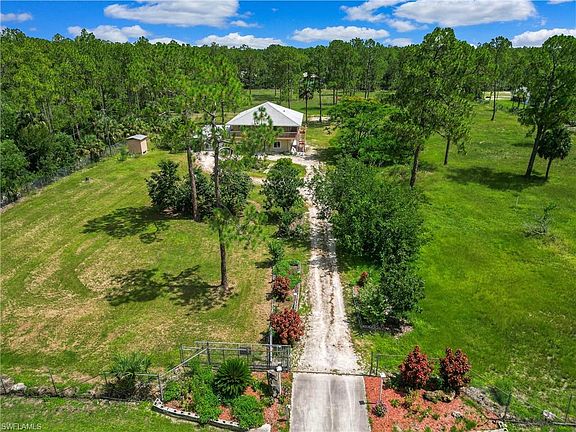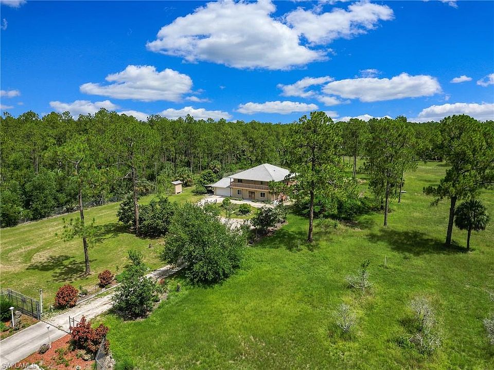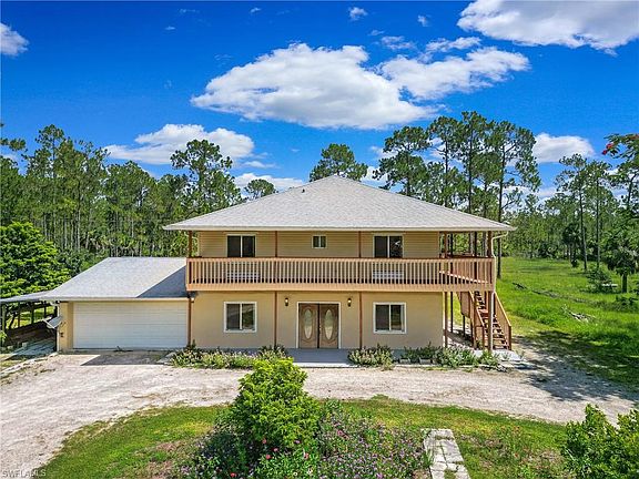 Motivated seller says bring all offers to this 5 acre fenced and gated home in beautiful Golden Gate Estates. The home boasts over 2500 sq ft of living space upstairs and downstairs with a newer roof (2017). Primary residence is upstairs, with 3 bedrooms and 2 baths, split bedroom for privacy, raised ceilings, and open living concept. The upstairs is surrounded by a wrap around balcony on three sides to enjoy the beautiful outdoors. Possibilities abound from multi family use, business use, and possibility to divide the acreage. Drive thru garage, double automatic doors, which can easily hold 3 cars, a work area, equipment, or several toys. There is also an outer carport which extends more versatile space for the family, outside patio, wash sink, washer and dryer. There is another storage building on property. Plenty of room to expand: add a pool, guest house, or hobby farm, second full home on other 2.5 acres. This home is original and ready to meet its new family. No HOA fees.