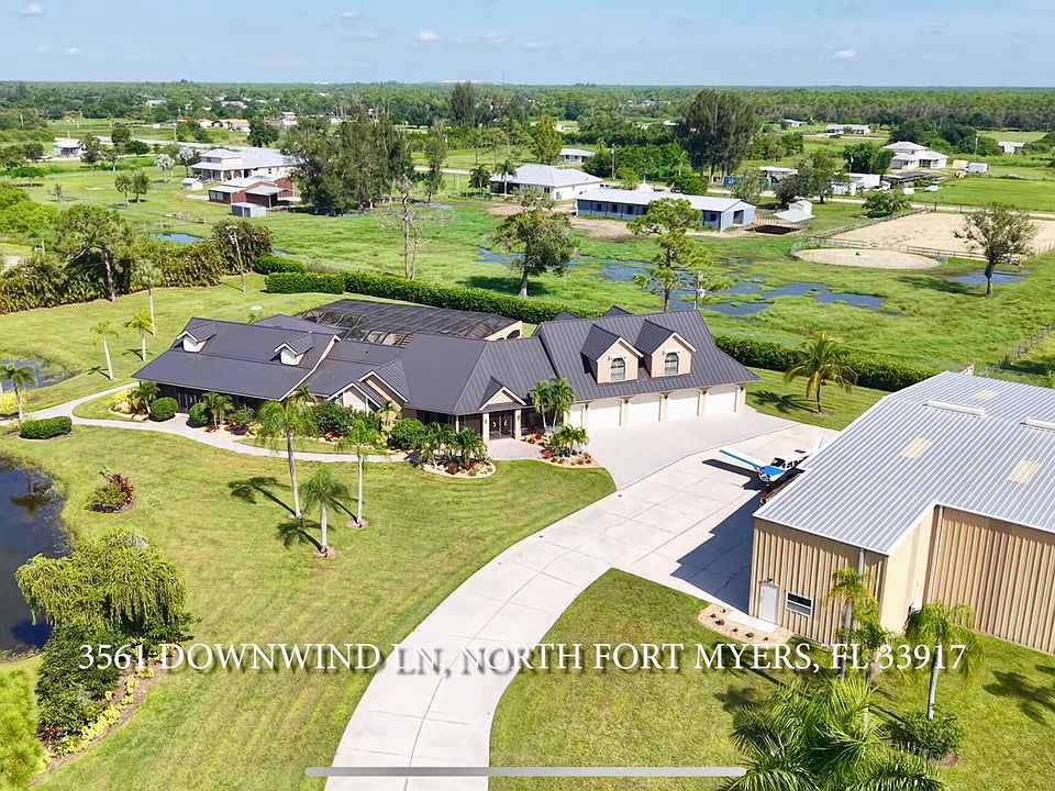 Nestled in the prestigious Pine Shadows Airpark, 3561 Downwind Lane offers an unparalleled blend of luxury living and aviation convenience. This meticulously maintained property, complete with a private hangar, modern upgrades, and resort-style amenities, is a dream for aviation enthusiasts and those seeking a high-end lifestyle in Southwest Florida. Below is a detailed overview of the property's standout features.Key FeaturesPrivate 80x80 Hangar with Modern Amenities:Spacious 80x80 hangar (18 ft height x 76 ft wide) with four 12X12 doors, a 50-amp RV hookup, and water access for your RV. Features a 400 sq ft updated office with bathroom, ideal for a home office. Luxurious Main Residence with Upgrades:Equipped with a new metal roof (2023), hurricane windows and shutters with smart modules, a whole-house reverse osmosis (RO) system (500 gallons), and a whole-house generator for ultimate comfort and security.