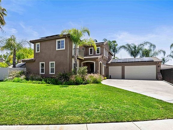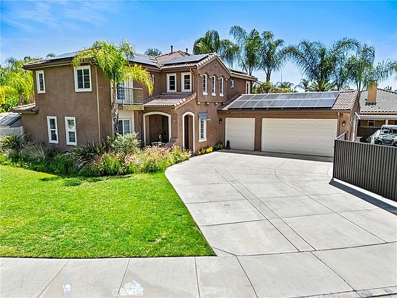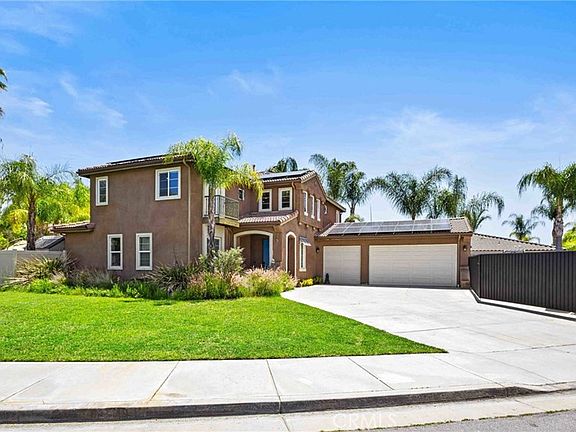 Welcome to your dream home in French Valley! This impressive 2,784 sq ft residence stands out with 5 bedrooms and 3 bathrooms, offering plenty of space for everyone. One of the biggest highlights is the backyard—think custom in-ground POOL and SPA & landscaping. It’s the perfect spot to unwind, entertain & enjoy the California sunshine in privacy. Need space for your toys? The OVERSIZED 10,454 sq ft lot features a 3-CAR GARGE, plus rare GATED 5-CAR RV ACCESS, and a LONG driveway that makes parking a breeze. Whether you have an RV, a boat, or just love having room for guests, this setup is hard to beat.Inside, the open floor plan is filled with natural light & high ceilings. This home is energy efficient too, thanks to 33 PAID-OFF SOLAR PANELS- 15kw solar panel system, 3 (5kw) battery storage, transfer switch to allow power during a power outage. This way you don't lose power even if there is an outage from SCE. The main level includes a HIGHLY DESIRABLE DOWNSTAIRS BEDROOM with its own living area and full bath—perfect for guests, in-laws, or even a home office. The living room seamlessly opens to the dining area and kitchen, perfect for entertaining. The living room with a fire place, recess lighting.The kitchen features granite countertops, an island with seating and ample storage with a wall of cabinets, an eating nook area & recessed lighting. Enjoy stainless steel appliances, including an oven, cooktop, and dishwasher. Also downstairs, a convenient laundry room awaits, featuring shelving for extra storage and direct access to the garage. Upstairs, you will find a combination of tile and plush carpet flooring throughout. The large master bedroom is a true retreat boasting a private balcony with beautiful views, plush carpet, and a window flooding the space with natural light. The master bathroom includes tile flooring, a walk-in closet, double sinks, a private toilet area, soaking bathtub & a walk-in shower. The 3 additional bedrooms provide ample comfort, each featuring plush carpet, windows & closet space. The upstairs hallway bathroom offers a single sink vanity, tile floors, & a shower/tub combo. Laundry room has extra storage and direct garage access. Location-wise, you’re on a quiet cul-de-sac close to shopping, freeways, & everything you need. If you’re looking for a large pool home with a flexible floor plan, tons of parking, & that hard-to-find downstairs suite, this one checks all the boxes. Don’t miss your chance!