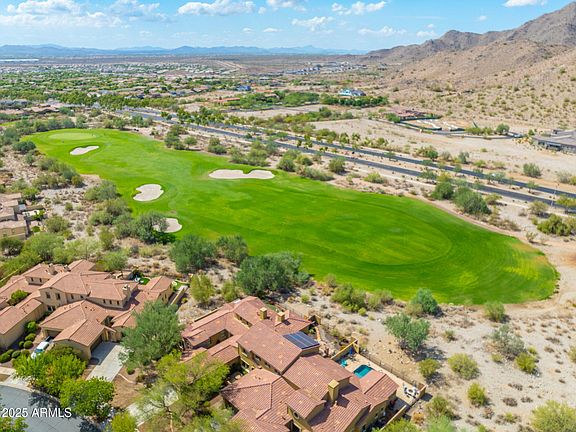 Golf course view + sunsets every evening...it's not a dream, it's a reality in this gated Vallarta neighborhood of Verrado. A highly sought-after villa perfect for wintering in AZ with a lock-and-leave set up, or make it home year-round! HOA covers the front yardwork, exterior painting, and provides Vallarta residents with a private community pool, spa, and gathering area in addition to Verrado's luxury amenities. Located on the 4th fairway of Verrado Golf Club's Founders Course, enjoy lush greenery as you grill your favorite cuisine at the built-in BBQ kitchen. Extend the large awning for more shade over the back patio, then watch the colors of the Arizona sunsets fill the sky each evening. Additionally, entertain guests with a game of bocce ball on the side yard court or practice putting on the 2-hole green. During the cooler months, enjoy the views through the patio windows as you cozy up by the fireplace in the great room with a soaring decorative ceiling and clerestory windows designed to bring in natural light. This 3 bedroom, 2 bathroom home showcases luxury vinyl plank flooring throughout, creating a seamless transition from every freshly painted room. Enjoy your hobby in the air-conditioned extended garage or walk Verrado's tree-lined streets and pathways. Cruise in your golf cart to Main St for a lovely dining experience or workout in the state-of-the-art fitness center. With a club for everyone and gatherings in the parks, Verrado makes it easy to meet your new friends.