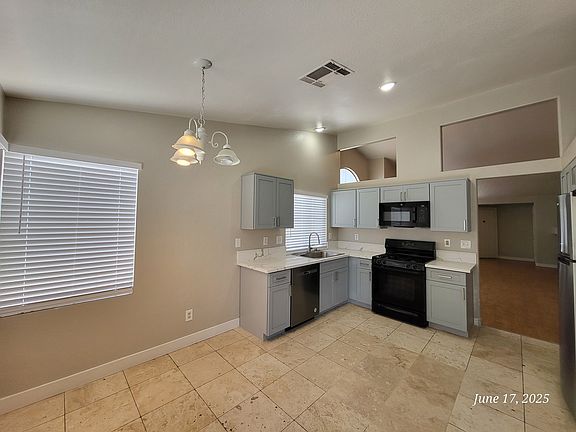 Charming 3-Bedroom Home for Rent Move-In Ready! Available Now! Step into comfort and convenience with this beautifully updated 3-bedroom, 2-bath single-story home located in a quiet and well-maintained neighborhood. Freshly painted exterior with excellent curb appeal Spacious and bright living room with vaulted ceilings and a cozy fireplace Open-concept layout with plenty of natural light throughout Fully upgraded kitchen featuring modern light-blue cabinetry, quartz countertops, and sleek black and stainless-steel appliances Tile and laminate flooring throughout no carpet! Attached 2-car garage with wide driveway Low-maintenance desert landscaping in both front and backyards. Close to schools, parks, and shopping centers