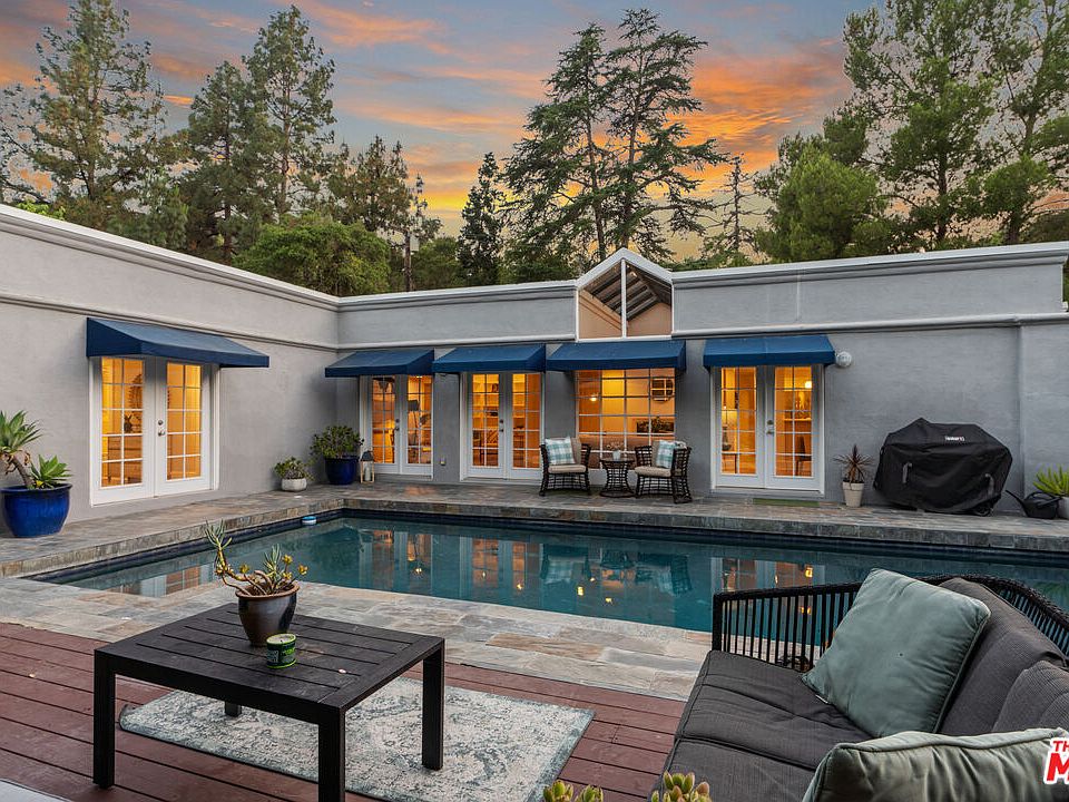 Discover an unparalleled retreat in the hills of Sherman Oaks, where peaceful seclusion meets the pulse of city living. Elegantly nestled among majestic oaks, this standout home evokes treehouse vibes with stunning hillside views. Experience the prestige of Bel Air living with the value of Sherman Oaks, just minutes from the Glen Centre and the vibrant energy of Ventura Blvd. Step inside to soaring ceilings, skylights, and rich hardwood floors that brighten the open-concept layout. The spacious living and dining areas flow seamlessly through French doors to a charming patio and sparkling pool, perfect for entertaining under the stars. At the heart of the home is a sleek, newly renovated kitchen with stainless steel appliances, a quartz breakfast bar, and stylish finishes throughout. The ideal bedroom layout offers privacy and comfort, with each room showcasing unique views of the lush surroundings. The serene primary suite features a spa-like ensuite with a soaking tub and a skylight-lit double vanity. Outside, enjoy scenic strolls with breathtaking valley vistas and access to top-tier schools like Curtis, Buckley, and Harvard-Westlake. This is a rare blend of tranquility, style, and location, your hidden gem in the heart of the hills.