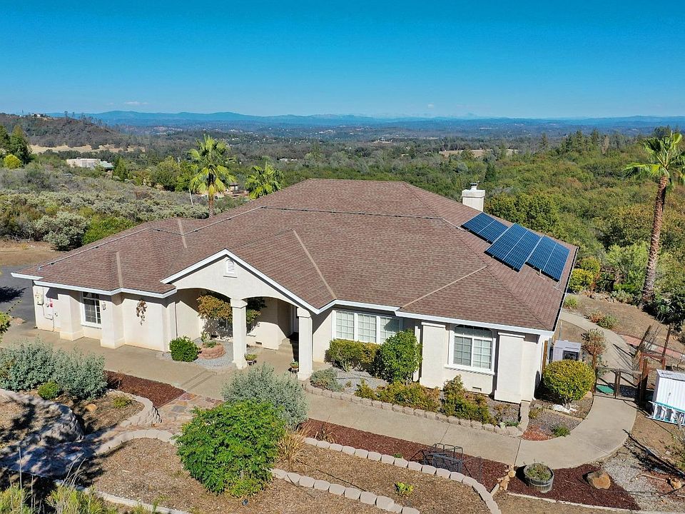 $100k PRICE IMPROVEMENT! Retreat to this private gated home with sweeping panoramic VIEWS, a sparkling POOL, OWNED SOLAR & a Tesla BATTERY BACK-UP! Amazing views of the Sierras from this single story home on 5 acres with room for horses & RV/boat parking. Gorgeous fenced pool with a waterfall is perfectly situated to take in the beautiful sunsets. 3 generously sized bedrooms PLUS large office/4th bedroom & 2.5 baths, separate living & family room, spacious laundry room & 3-car garage. Central location offers convenience to restaurants & shopping yet allows a feeling of your own private oasis.