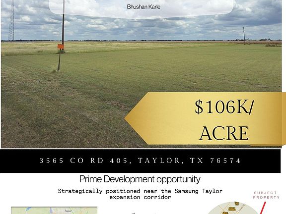 Exceptional ±50-acre opportunity located just 6 miles from the Samsung Taylor Plant in the rapidly growing Taylor, TX area. Situated in unincorporated Williamson County under county jurisdiction, this property offers no city zoning restrictions, streamlined approvals, and maximum development flexibility—a major advantage over nearby sites within the Taylor ETJ. The land is flat with excellent soil and minimal floodplain, making it shovel-ready for a variety of uses including data centers, industrial, workforce housing, or tech corridor expansion. Utilities are nearby, and multiple power substations in the area strengthen its suitability for large-scale projects. Enjoy unmatched regional access via Hwy 79, Hwy 973, and SH-130, putting Downtown Austin and Austin-Bergstrom International Airport within an hour. Surrounded by explosive growth from Samsung, Apple, and Tesla, this corridor represents one of Central Texas’s most dynamic investment opportunities. Listed by the Chris Smith Group, trusted experts in Central Texas commercial real estate.