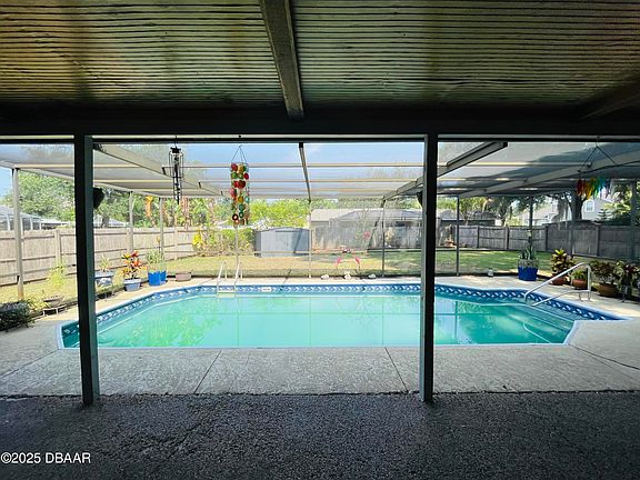 This charming 3-bedroom, 2-bath home features a 2-car garage and a screened-in pool with a spacious covered outdoor living area, complete with an outdoor shower and a fenced yard. Enjoy the convenience of a community park directly across the street, offering a fishing dock, playground, and partial views of East Lake.