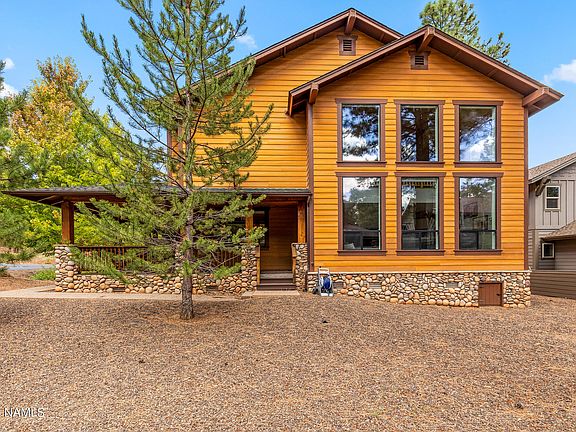 Inside, the home showcases solid hickory hardwood floors, rich wood detailing throughout, and vaulted ceilings that enhance the warmth and elegance of the space. The open-concept main level features a seamless flow between the kitchen, dining area, and living room, ideal for entertaining. The kitchen is well-appointed with two pantries and opens onto a spacious 750 sq ft covered wrap-around deck, perfect for year-round outdoor dining and relaxation. Enjoy the peaceful mountain air rain, snow, or shine from this inviting outdoor living space. The living room features floor-to-ceiling windows that flood the space with natural light and a stunning stone fireplace that adds character and coziness. Another access point to the deck makes indoor-outdoor living effortless. Upstairs, the primary suite offers two large closets and continued hickory wood accents. Two guest bedrooms each include custom built-in hickory benches and walk-in closets also. Also upstairs, a generously sized loft provides flexible space for a second living room, office, or play area. Whether you're looking for a full-time residence, seasonal retreat, or investment opportunity, this home offers the ideal Flagstaff lifestyle in a premier location.