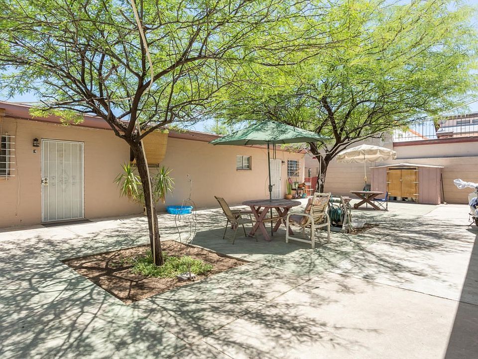 Two triplexes on each side of a central patio shaded by mesquites. One bedroom one bath units with wood beamed ceilings and gallery kitchen. Electric and gas are individually metered.This property must be sold with MLS# 21618853.