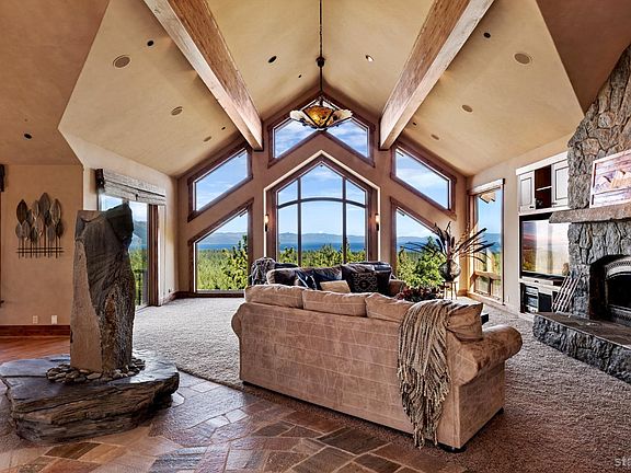 Beyond a stately iron gate and down a winding drive framed by native pines and granite outcroppings lies one of South Lake Tahoe's most exclusive alpine compounds. Perched atop the crown of a five-acre sanctuary, this private estate commands panoramic views spanning Lake Tahoe's crystalline waters, the iconic silhouette of Mt. Tallac, and a skyline of surrounding summits. Offering a rare blend of scale, seclusion, and scenery, the property lies at the intersection of wilderness and world-class convenience---just moments from Heavenly's CA Lodge and the famed Powerline Trail.- - Crafted by one of the region's most respected builders, the architecture harmonizes bold timber elements, dynamic rooflines, and artisan stonework---uniting durability with timeless design. Thoughtfully sited among granite formations and bathed in sunlight, the home is both immersed in nature and buffered from the outside world.- - A true-arched entry leads into a grand foyer with soaring ceilings and a quartzite-floored fountain. The great room makes an immediate impression with massive purlin beams, floor-to-ceiling windows, and unfiltered views. A stone-wrapped fireplace with hammered copper accents anchors the space, while radiant heat beneath distressed oak floors adds comfort throughout.- - An open layout connects to a chef's kitchen, where Alder cabinetry meets live-edge sandstone countertops. Commercial-grade appliances, a walk-in pantry with dumbwaiter, double wall oven, and warming drawer enhance daily functionality. A cozy breakfast nook beneath turreted cedar ceilings adds warmth and charm. An expansive L-shaped composite deck offers a front-row seat to sunsets and starry skies.- - The main-level primary suite evokes a private lodge feel with a sitting alcove, fireplace, dormered ceilings, and secluded balcony. A spa-caliber bath features dual vanities, hammered copper sinks, a steam shower with dual heads, and an infinity-edge soaking tub. The walk-in wardrobe includes detailed millwork, organization, and a split laundry chute.- - Downstairs, two additional suites showcase natural stone finishes, designer lighting, and custom cabinetry. The secondary living space is perfect for entertaining, with built-in surround sound, gaming space, wet bar, and a native granite fireplace with hand-hewn mantle.- - Other features include an executive office with antique-finished built-ins, full laundry center, fire suppression, integrated audio, and a climate-controlled three-car tandem garage with dog wash. Hydronic radiant heat, an indirect boiler-fed hot water system, and central vacuum optimize efficiency. - - Every inch of this retreat reflects thoughtful craftsmanship and enduring materials, wrapped in distressed alder and finished in Ralph Lauren's warmest tones.- - With 7,000+ square feet of remaining coverage, the possibilities for expansion---are as limitless as the views!
