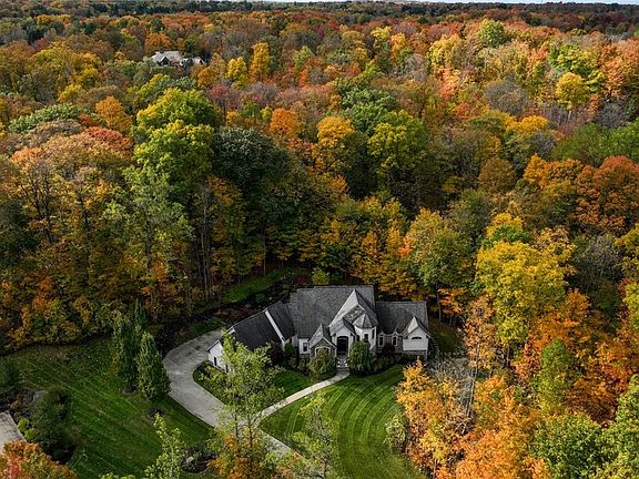 An oasis of luxury & tranquility by Ruggiero Builders. Nestled on 2 wooded acres w/ a gentle creek & sweeping natural views, this extraordinary custom built home combines elegance, comfort & superior craftsmanship. From the moment you step inside, the home’s warmth & architectural detail unfold accented with spectacular Restoration Hardware lighting. As you enter, a grand great room is anchored by 2-sided stone fireplace, coffered ceilings & a wall off windows framing the scenic landscape. State-of-the-art kitchen boasts a generous granite island w/ breakfast bar, custom wood cabinetry & high-end appliances. This exceptional kitchen showcases an open floor plan that effortlessly connects the dining area/hearth room where a 2-sided fireplace adds warmth & character. Inviting sunroom w/dramatic vaulted ceiling & 3 walls of windows frame picturesque views of the outdoors. Designed for comfort, this layout creates a welcoming atmosphere. Retreat to the first floor primary suite, a serene haven w/ spa inspired glam bath, soaking tub, granite vanities, & walk-in glass shower. Oversized, custom walk-in closet, w/ his/her areas & built-ins. Adjacent library w/ rich millwork & double entry doors provides a perfect setting for work/relaxation. Upstairs, 3 large bedrooms offer privacy & comfort, incl. one ensuite & a well-appointed jack/jill bath. Walk-out lower level is designed for enjoyment/entertaining. Full wet bar w/ granite counters, wine coolers, & high-top seating for 12 boasts a game room, rec room, & gym designed for fun & relaxation. Half bath & wine storage complete this level. Take the fun outdoors & walk out to the yard & fire pit for cozy evenings. Outdoor living rivals the interior w/ a beautiful silver travertine patio for dining w/ built in grill, granite bar & gas fireplace table. The property is enhanced with integrated security & exterior cameras. This is more than a place to live-it's a place to create memories, unwind in style & live your best life!