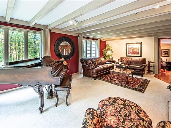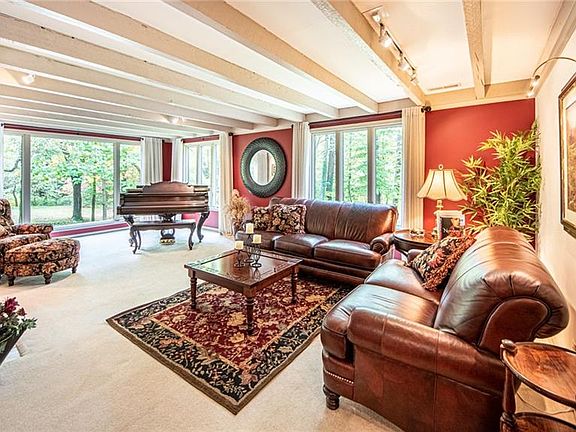 Sensational idyllic setting on 6.4 scenic wooded ac. presents enchanting design w/impeccable appointments & custom finishes throughout. Welcoming front patio overlooks pond. Gracious foyer w/open staircase & gleaming hdwd floors. Inviting formal liv rm boasts walls of windows, beamed ceiling, & brick fireplace. Cozy formal din rm features hdwd floors & buffet alcove. Separate wing leads to two spacious bedrooms (one with fireplace & WIC), main full bath, & an additional open vanity. Amazing, sunken gourmet kitchen, offers two islands/breakfast bar, skylights, SS appliances, walls of cabinetry, granite, planning station, sep. eating area; spans front to back of home with fantastic views. Engaging family room features cathedral ceiling, skylight, arched picture window, tile floors, and nearby cubby office w/floor to ceiling windows. Awesome 2nd floor master ste highlights an incredible sitting room w/fireplace & walls of built-ins, WIC, glamour bath w/soaking tub & heated tile floors. Laundry rm conveniently located on 2nd fl. Fabulous walk-out LL includes family room, bdrm w/stone fireplace, & full bath. Double doors to workshop. Multi-level deck w/built-in bench seating offers picturesque views of landscaped grounds & wooded backdrop. Heated gar. and heated gar. floors. LL laundry hookup. Additional updates: newer windows, new septic 2020, concrete driveway. Notable highlights include brick walkway to bridge, decks, covered gardens, shed, creek, pond. A delight to show!