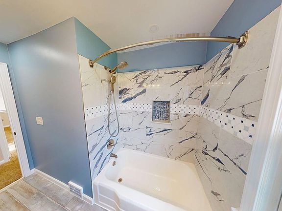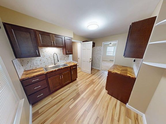 Sleek backsplashUpdated bathroomElegant marble-style tileworkButcher-block countertopsPremium rainfall showerheadFresh paintRenovated kitchen