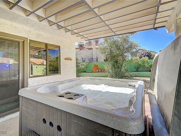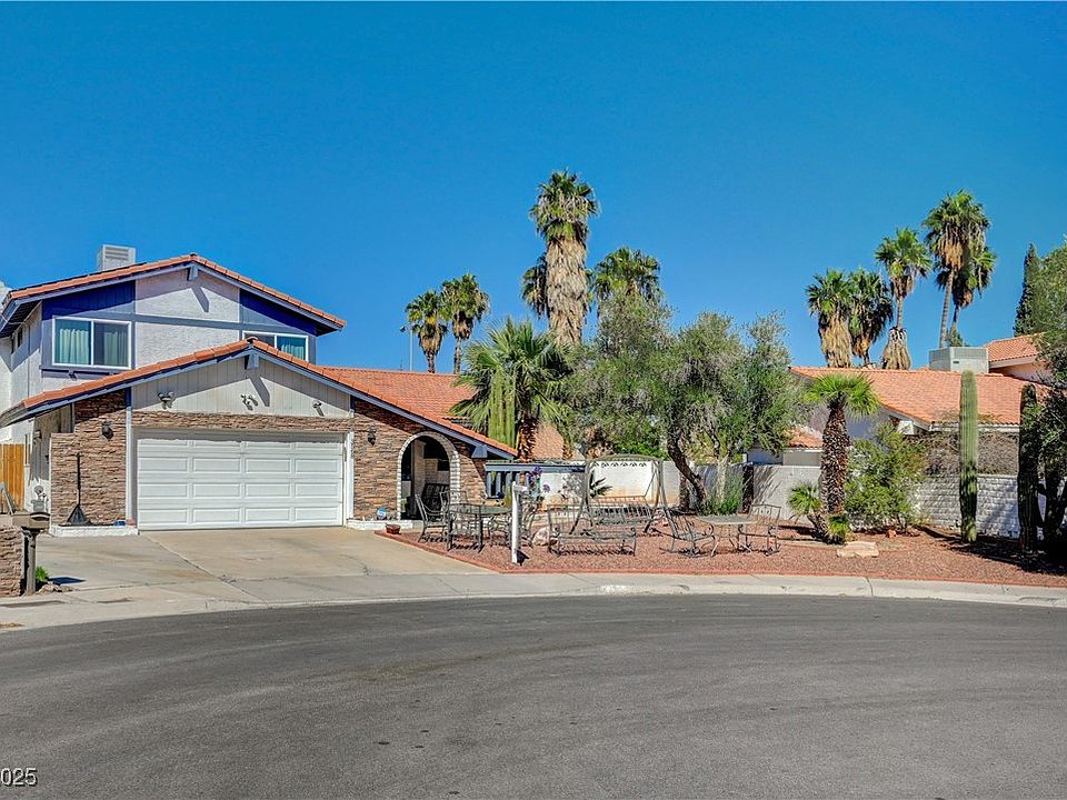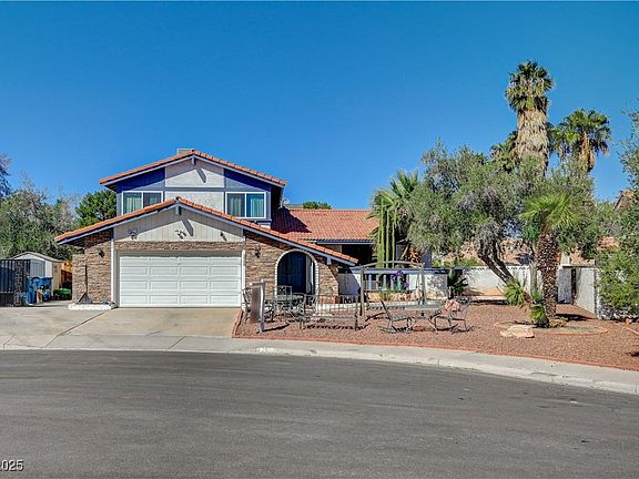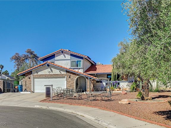 Come home to this energy efficient las vegas gem, nestled at the end of a culde sac and featuring over 2,134 Sqft of living space on an oversized 10,034 sqft lot with 3Full BR, 3Full Baths, & 2 Car Garage. Step through the formal courtyard entry & through the double doors into this tri-level floor plan with 2 living rooms, with gas fireplace, formal dining area and eat in kitchen with upgraded cabinets that offer a deep pantry storage. New windows, sliding door & AC System. Spacious master bedroom with extended master bath and custom walk in closet. Covered patio with spa. Side area for extra parking and storage. New AC sytem installed in 2025 & PAID OFF SOLAR. New doors and windows for extra energy efficiency. Freshly painted bedroom. Oversized second upstairs bedroom. All appliances included with tankless water heater, epoxied garage floor & full home RO system.All accompanied by a 1 year warranty.