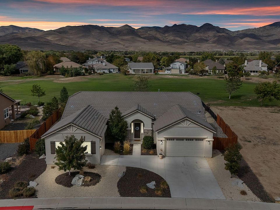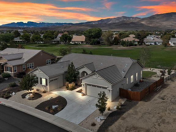Golf Course Beauty in Bayhill at Dayton Valley! 4-bedroom, 2.5-bath custom home , Designed for comfort, entertaining, and everyday living, this property offers breathtaking mountain views, thoughtful upgrades, and a functional split floorplan. Step into the bright and open living space, where a spacious great room features a cozy gas fireplace, seamlessly connected to a large kitchen equipped with granite countertops, double ovens, a gas cooktop, breakfast bar, and nook — perfect for gathering with family or friends. Entertain in style in the formal dining room, located just off the entryway, highlighted by a coffered ceiling. The split floorplan places the luxurious primary suite on one side of the home, complete with a spacious master bath, double sinks, garden tub, and a huge walk-in closet. The opposite wing includes three additional bedrooms, a full bath, and access to the separate 3rd car garage — ideal for guests, hobbies, or storage. Outside, enjoy custom landscaping, a beautifully manicured backyard, automatic sprinklers & drip system, and a gas stub for BBQ — ready for your outdoor kitchen or grill setup. Additional highlights include: 3-car garage (2-car + separate 1-car) Auto sprinklers and drip system, Gas stubbed BBQ patio, Double sinks in master bath, Golf course community living. Don't miss this opportunity to own a beautiful home in a prime location. Whether you're entertaining or relaxing, this home has it all. Call today to schedule your private tour!