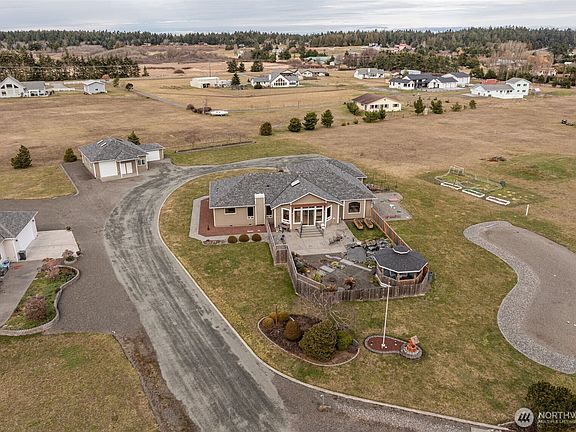 Mountain vw home on over an acre w/huge heated shop in one of Sequim's best neighborhoods. At the end of a paved road of beautiful estate homes, it's a short walk to the miles of Dungeness Recreation trails. New hardwood floors, roof, & heat pump. Fenced backyard w/water feature, beautiful Dogwood & Magnolia trees, patio & Gazebo. Great rm concept w cozy family rm off the kitchen, whole house speaker system, propane fireplace, library/living rm, wet bar & a formal dining rm. Primary BR suite offers views, a chandelier, bathroom w/jetted tub & separate shower. In addition to the 3 car garage is a heated 1680sf shop w/220 pwr, dust collection system & full bath. RV pkg area w/power & water. This is a beautiful property in an ideal location.