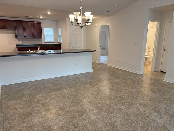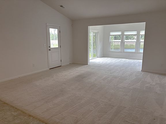 The open floor plan makes for a spacious living room and dining room area. Offering vaulted ceilings in the dining room for a larger feel. Natural sunlight throughout the Carolina room. Two ways to access the backyard, the slider or single door; leading to the concrete pad. Outside is a covered porch for views of the pond.
