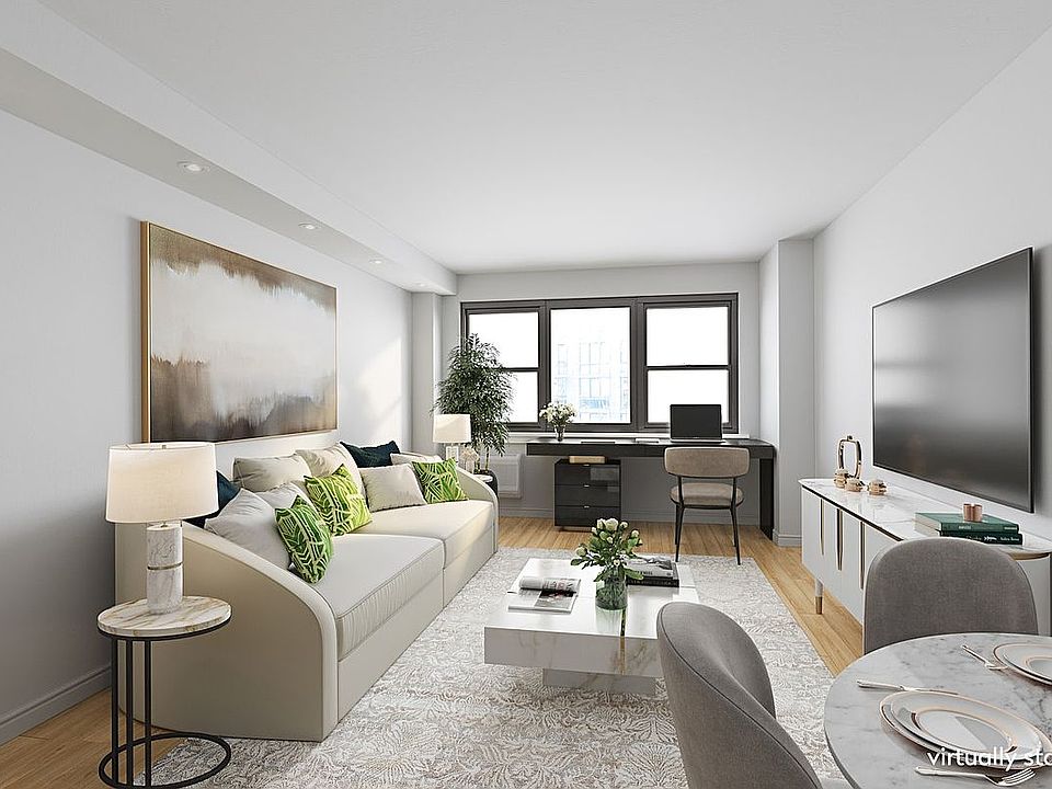 This newly renovated, move-in ready one-bedroom, with bright southern exposures is a rare find. Apartment features golden-toned wood floors, new customized ceiling lighting, new electrical, through-the-wall A/C units and an Electrolux washer/dryer. The generous-sized bedroom has two closets and easily accommodates a king-sized bed. The kitchen has sleek, modern cabinets, stainless steel appliances and Silestone counter tops. All five closets including a tremendous walk-in have custom shelving and lighting. The bathroom features basket-weave marble flooring, contemporary subway tiled walls a Toto toilet, rain shower with hand spay and a floating vanity.