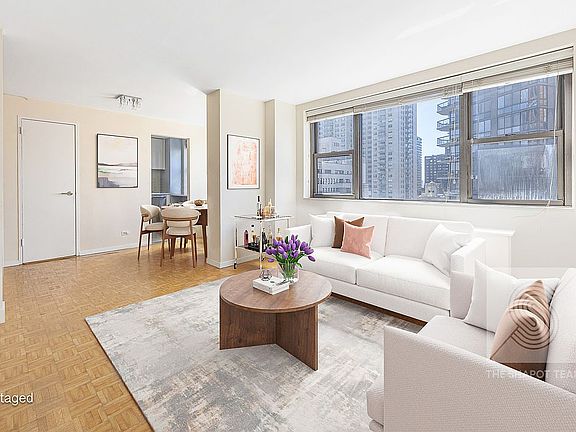 Residents of this polished mid-century building enjoy the luxury and convenience of a renovated lobby, 24-hour door staff, live-in super, and a panoramic roof deck that offers incredible views of the East River, Roosevelt Island Tram and 59th Street Bridge, abundant sunshine and twinkling nighttime lights (beyond those in the apartment!). Common laundry, storage (for a fee) and an on-site parking garage parking are available (also for a fee). Pets are permitted with board approval. Pied-a-terre ownership is permitted, as are guarantors, and parents buying for children.
