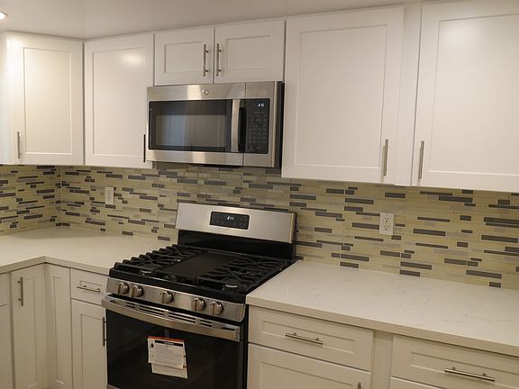 * Updated kitchen with sleek white quartz countertops, custom cabinetry, and stainless-steel appliances (stove, dishwasher, and built-in microwave)