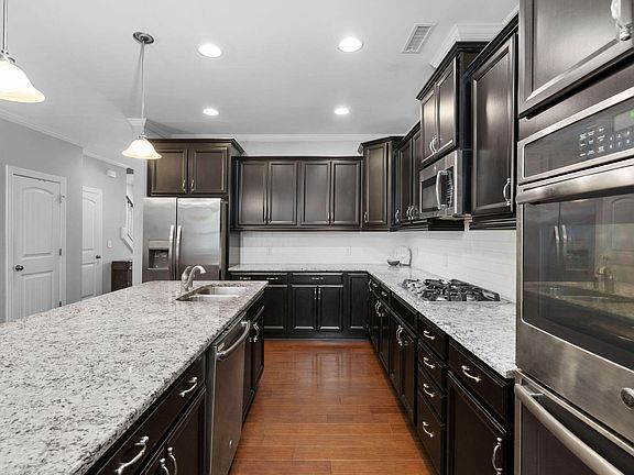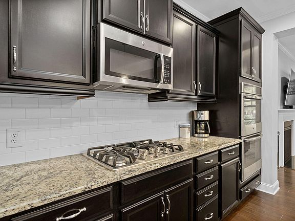 Welcome to this stunning 3-story townhome in the sought-after Harrison Bluffs community! From the moment you step inside, you'll notice the sleek, modern decor that flows seamlessly throughout. The first floor features a spacious gourmet kitchen with a gas cooktop, double wall ovens, and a large island perfect for meal prep or casual dining. It's open to the dining area and a cozy family room with a beautiful fireplace—ideal for relaxing or entertaining guests. Step outside onto the screened porch, which leads to a private paver stone patio and a lovely backyard that backs up to serene wooded views—providing a peaceful retreat. Upstairs on the second floor, you'll find three comfortable bedrooms, including a spacious master suite. The third floor offers a versatile bonus room, complete with a built-in Murphy bed, making it perfect for guests, a home office, or even another bedroom. Located just a short distance from downtown Cary, you'll have plenty of shopping, dining, and entertainment options within walking distance. It's the perfect blend of modern living, convenience, and charm!