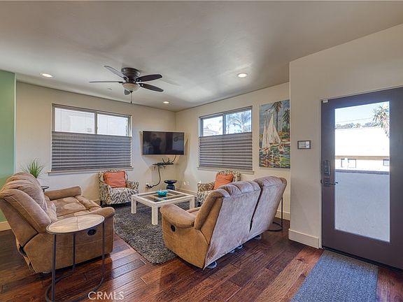 Stunning Mediterranean-style condo just two blocks from the sand, pier, and vibrant downtown dining and shopping. Offering the flexibility of full-time coastal living, a luxurious vacation retreat, or an income-producing investment, this property is currently being utilized as a licensed short term vacation rental. The 3-bedroom, 3.5-bath 1769 sq ft residence includes a private 1-bedroom, 1-bath Casita with kitchenette and separate entrance—ideal for guests or extended family stays. From the spacious 2-car garage, a private staircase leads to the main living level, while a separate staircase from the street provides additional access for convenience. Inside, wood floors flow throughout the open-concept living and dining areas, complemented by a chef’s kitchen featuring quartz counters, stainless steel appliances, and high-end finishes. A powder room completes this level. Upstairs, the luxurious primary suite offers a serene sitting area and spa-like en-suite bath with dual vanities and a large walk-in shower. A second bedroom with full bath and a conveniently located laundry room complete this floor. The ground-level Casita offers flexibility with its own access from the street or garage. Crowning the home, an expansive rooftop deck captures panoramic ocean views—perfect for entertaining or savoring spectacular sunsets. Combining elegant finishes with modern convenience, this property embodies the very best of upscale beachside living with exceptional income potential.