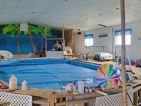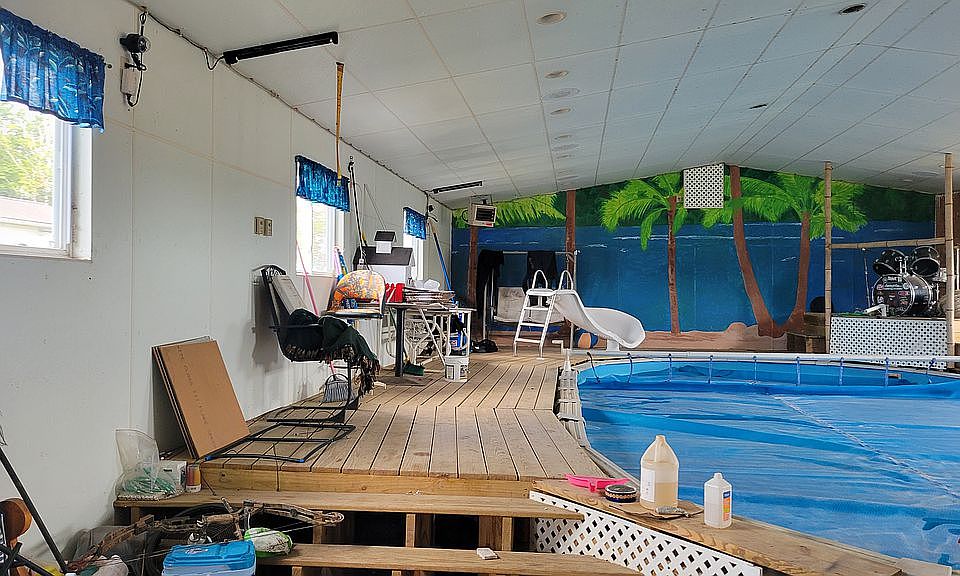 Detached 30 x 100 shed with indoor pool, tiki bar, changing rooms, Kitchen, 2 car and single car garage.
