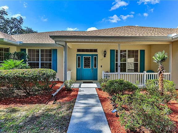 This 2002 custom-built Citrus Hills home features 4 bedrooms, 2 bathrooms, and a 23x33 three car garage - 2,365 Square Feet under air! The 1.24-acre lot with surrounding trees provides privacy from all sides, room for a large pool and exterior entertainment deck, and the long concrete driveway and addition parking pad can easily accommodate several cars. This home has ample closet space and extra storage above the garage, accessible by big & wide pull down stairs. The existing 20x14 covered and screened lanai is accessible from the living room and dining area. This original owner enjoyed many years here and has maintained the home in top condition, upgrading the ac system in 2017, roof in 2023, routine septic maintenance, new exterior paint in 2020, and several recently upgraded appliances and the water heater. NO FLOOD ZONE AREA SO SAVE ON YOUR INSURANCE. HOA fees only $78 per YEAR. Wood cabinetry, a central vacuum system, ceiling speakers in the central living area, and a Honeywell Media Air Cleaning filtration system are just a few of the other features that make this a must-see Citrus Hills home for all buyers.