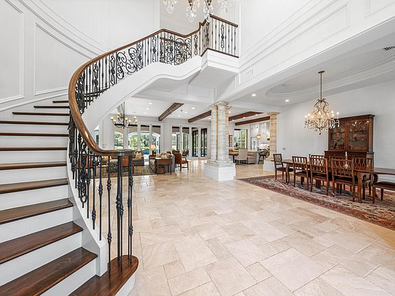 The main-level primary suite is a private retreat featuring wide-plank wood floors, a custom chandelier, dual vanities, a make-up counter, marble finishes throughout, and his-and-her walk-in closets. Also on the main level are a richly appointed office with custom built-ins and an additional guest suite with an ensuite bath.