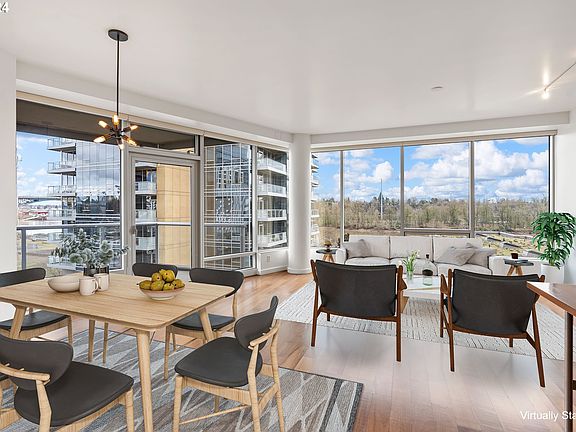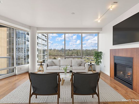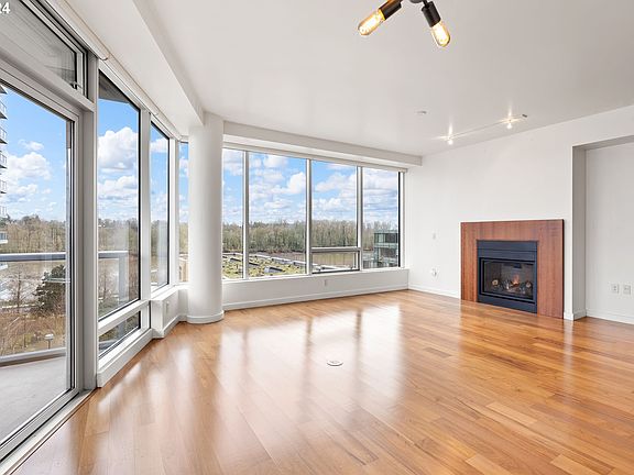 Beautiful, light-filled Meriwether home perched over the Willamette River! This turn-key 1 bedroom, 2 bath home offers a fantastic floor plan with a separate den/office space, perfect for modern day living. Enjoy river & city views from the floor-to-ceiling windows or from the comfort of your private balcony. Open living space features electric blinds & fireplace, large kitchen with island, wine fridge & high-end appliances. Spacious primary suite has walk-in closet w/ built-ins & bathroom with double sinks. Home is complete with one deeded parking space. Welcome to the best of South Waterfront living w/ trails, restaurants, OHSU, Streetcar & more at your fingertips.