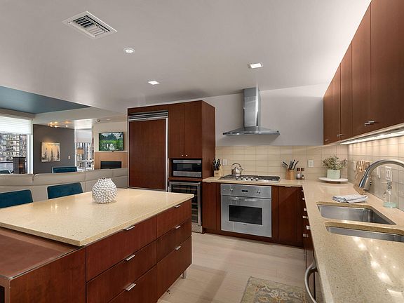 Meriwether Condo/South Waterfront - Willamette River View - X-Large Covered View Terrace - 2 BR,Den,2 Bath,1605SF - 2 Deeded Side by Side Parking Spaces - Lg Great Room with Fireplace - Light Filled Den/Office - Elegant Master Suite - Gourmet Island Kitchen features Viking Appliances - Large Utility/Pantry - Power Blackout Shades in Both Bedrooms - Floor to Ceiling Windows - Hardwoods, Quartz & Marble Surfaces