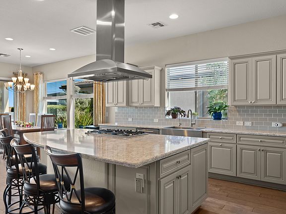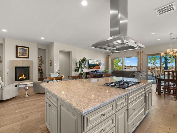 Cozy fireplaceCustom fireplaceMountain viewsGas cooktopDouble ovensLarge island with seatingPristine turf