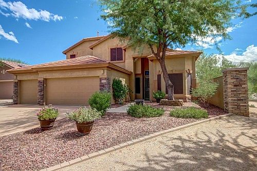 Lovely Tramonto home for lease. Move in ready with a great tri-level floor plan that offers a formal living room, family room, formal dining room and four spacious bedrooms + den. Beautiful vaulted ceilings, designer paint and wood & tile flooring in all the right places. Large eat in kitchen features stainless steel appliances, granite counters, center island and custom cabinetry. Laundry room, one bedroom and full bath downstairs. Bedrooms upstairs have plush carpeting. Master includes a walk in closet and spa like bath with garden tub, separate shower and dual sink vanity. Soak up all that the Valley of the Sun has to offer in the peaceful backyard complete with covered patio, green grass, fire pit and pristine desert landscape. This home is ready and waiting for you. See it today.