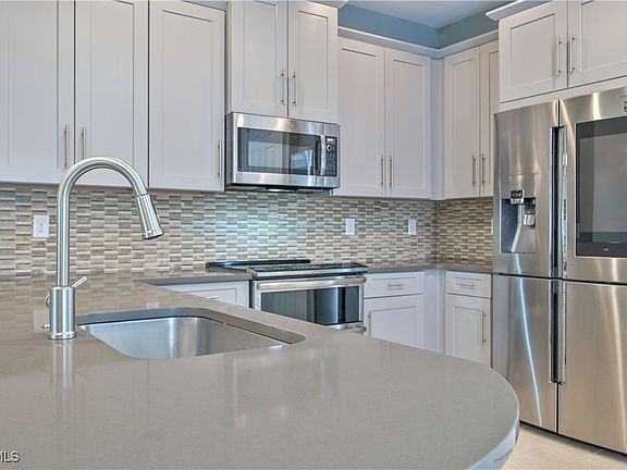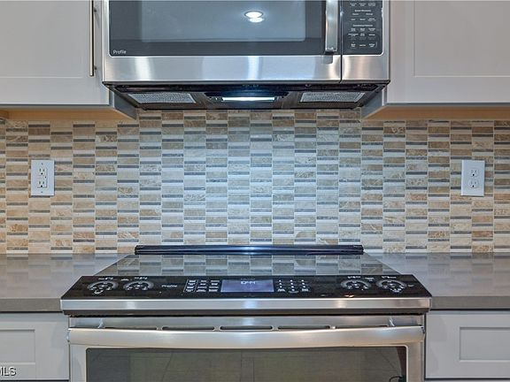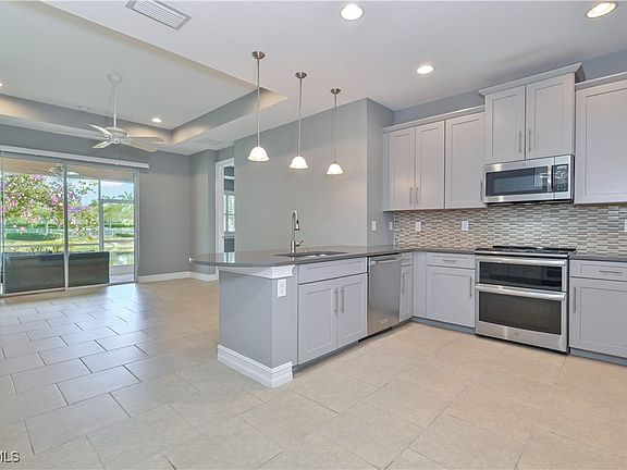 Live the Florida lifestyle in this beautifully maintained and freshly painted 3-bedroom, 2-bath home that is truly move-in ready. The upgraded kitchen offers quartz countertops, modern backsplash, smart appliances, upgraded cabinetry, and a built-in buffet with grey cabinets, quartz countertops, and a wine refrigerator, providing extra storage. This home features tile flooring throughout—no carpet, along with plantation shutters and thoughtfully designed custom closet organizers.