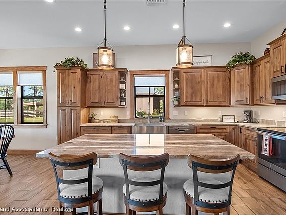 Country charm meets modern comfort with this this beautifully maintained 3-bedroom, 2-bath home on 7 acres with a barndominium. Fully fenced and nestled among abundant mature oaks on this peaceful countryside. Inside, you’ll find a spacious kitchen featuring granite countertops, stainless steel appliances, and soft-close solid wood cabinetry. .Perfect for everyday living or entertaining guests. Wood like plank tile throughout the home. Master suite offers dual vanities, a walk-in closet with custom real-wood shelving, and plenty of space. Step outside to your private outdoor entertaining area, complete with an above-ground pool, sink, refrigerator, grill, and outdoor dining space. Another great feature of this property is the massive 74x50 barndominium with three bays, a large upper storage area, and a fully equipped with guest house/mother-in-law suite. Ideal for guests, hobbies, or for storing all the fun toys. This property truly offers the best of both worlds. Quiet country living with modern farmhouse style and functionality.
