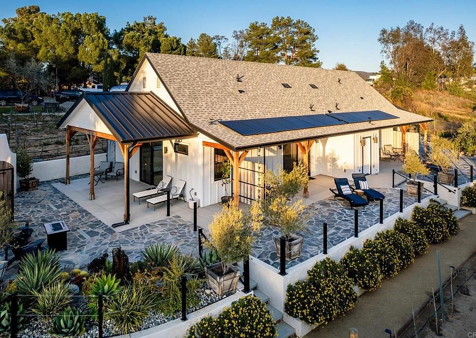 This stunning estate perfectly blends Temecula wine country living with a rare opportunity for fabulous rental income, all on 2.72 acres. Featuring a spacious 3,082 sq ft, 4-bed + office/3-bath main home, plus 4 newly constructed 1-bed/1-bath units totaling an additional 1,945 sq ft, these modern "casitas" were designed with an impeccable eye for style, functionality and rental income or luxurious guest accommodations. Enjoy them as they are now, or they can be easily converted into two duplex units. As you enter the property through the charming gated entrance, you'll appreciate the privacy and spaciousness for all things recreational. With your own sparkling pool, top-of-the-line solar systems, RV parking and actively producing vines, you'll never want to leave your private retreat. Upon stepping into the main home, soaring ceilings and travertine floors guide you to the expansive great room with an inviting wood-burning fireplace. A custom entertainer's kitchen awaits with stainless steel appliances, granite countertops, a Sub-Zero fridge, a 6-burner stove, and a wine fridge. An additional space for formal dining with another stone fireplace greets you at the end of the kitchen. The entry level also includes an office or additional bedroom, a full bath, and laundry room. The custom wrought iron staircase leads to the second floor, where the primary suite and 3 guest bedrooms, plus a guest bath, await. The primary suite boasts an oversized bath with a steam shower and a private balcony with views for days. The backyard off the main home offers a seamless transition to outdoor living with built-in BBQ area and an expansive brick pool deck. Across the property, a long path leads you to the 4-unit casita structure, tucked away for ultimate privacy. Completed in 2022, this licensed Airbnb offers both short- and long-term stays for those looking to explore all that picturesque Temecula has to offer. Let us welcome you home today!