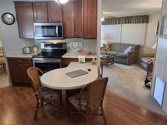 You Own The Land with this charming 2 bedroom, 2 bath home and it comes with a Park certificate valued at $11,500 that lowers the monthly maintenance fee to $214. This well-maintained home boasts numerous upgrades, including a new water heater, stainless steel LG refrigerator, Dyson vacuum, and new vapor barrier installed in 2024. The home also features all new subfloors with laminate flooring and carpet, custom kitchen cabinets with soft close drawers, a BOSCH stainless steel dishwasher, LG stainless steel oven, and Whirlpool microwave with exhaust fan. Both bathrooms have been updated with new vanity/sink, toilets, and exhaust fans. The home is being sold fully furnished with all furniture, kitchen wares, and more included. The master bedroom includes a king-size bed with a 7-piece set, while the guest bedroom has twin beds. The dining room features a Tommy Bahama style table with four chairs, a buffet, and other similar pieces of furniture. Other items included are a Broyhill couch, leather recliner, swivel rocker, two color TVs, modem, router, DVD player, custom window coverings, oil paintings, and artwork. Additionally, the home comes with a washer, dryer in the shed, bicycle, tricycle, and miscellaneous tools. The carport has space for two cars, and the northern facing screened front porch provides a comfortable place to socialize without the glare of the sun all day. The home is conveniently located in Phase 2 and a short walking distance to the pool and clubhouse. Tamiami Village is a 55+ pet-friendly community that offers a wealth of amenities, including three swimming pools, a spa, shuffleboard courts, horseshoes, billiards, two clubhouses, a fitness center, library, and a variety of social activities. Downtown Fort Myers, with its quaint shops and outdoor dining options, is just a short 15-minute drive over the scenic Caloosahatchee River. Alternatively, Fort Myers Beach and Sanibel Island, known for having some of the best seashells in the world, are also nearby. Join this vibrant and active community at Tamiami Village and start exploring today!