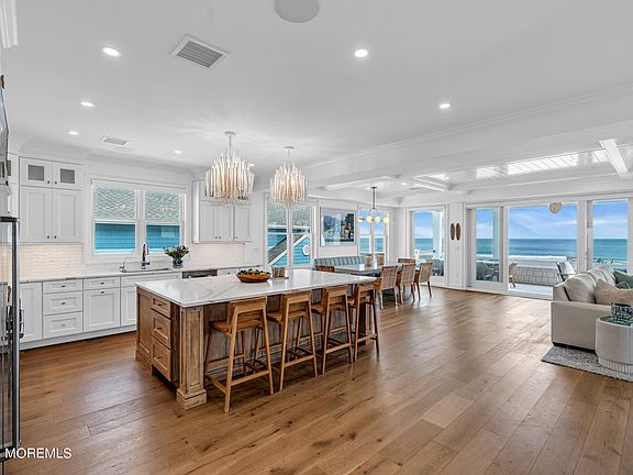 Exciting opportunity to own your piece of paradise with this extraordinary beachfront sanctuary. Step inside to discover a meticulously designed interior that seamlessly blends modern elegance with coastal charm throughout a 4-story, reverse living floor plan designed to maximize ocean views. Located in the prime Normandy Shores community, this home features 5 bedrooms including 2 primary suites & 2 custom-built bunk rooms, 5 bathrooms & 2 expansive outdoor patios to enjoy the soothing sound of waves crashing against the shore, greet each day with sunrise views over the water, and delight in unforgettable alfresco dining with family and friends. Additional features include a fully appointed gourmet chef's kitchen, 2 laundry rooms, 4-stop elevator, outdoor shower w/direct bathroom access, & fenced-in ground-floor patio featuring 480 sq ft of paver space & sandy beach. Step out to pristine Normandy Shores Beach, accessed through private back gate. Ground floor includes ample space for additional playroom, gym equipment w/Peloton, and ample storage for all your beach accessories. Large garage & parking spaces for 5 vehicles.