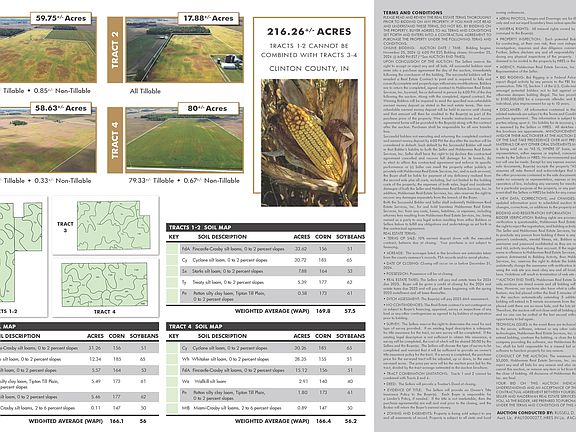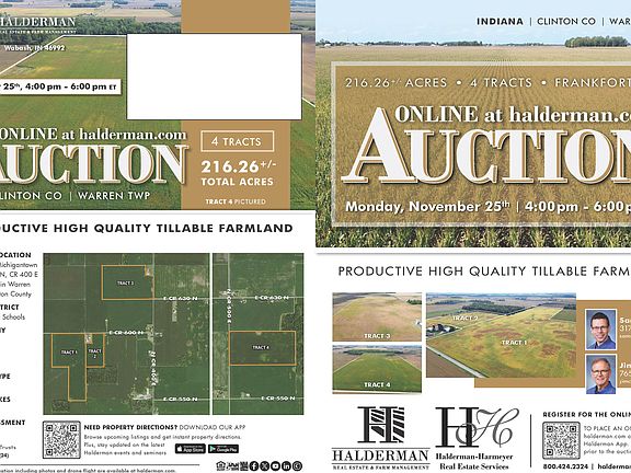 Online Only Public Auction 11-25-24. Listing is for Tract 1-2 and 4. Tract will sell individually or in combination. Four tracts available in total at the auction. Price reflects starting bid price. Productive, High Quality Tillable Land. Located in rural Clinton County with easy access to SR 29. Convenient to Kokomo and Frankfort. See included tract map for details on tract layouts and auction brochure for auction details. Sold As Is. Farm open for lease for 2025 crop year. Visit Halderman website for virtual tour and more auction details. Don't miss a chance to own all or part of this farm and great farmland investment property.