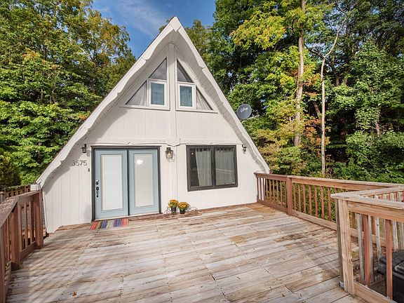 Charming A-Frame on a beautiful lot. This 3 bedroom, 1.5 bathroom home sits on 1.32 acres and offers over 1,900 square feet of living space. Step inside and you will find a large open living space, great kitchen with ample counter and cabinet space. 2 bedrooms are on the main floor with the 3rd bedroom upstairs. The finished basement allows for more entertaining or living space. Escape to the wrap around deck and enjoy the tranquility of the woods and stream at the back of the property. New furnace in 2018, water filter and purifier in 2019. Inspections welcome, but being sold as-is.