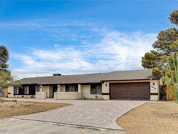 Experience country living in this spacious ranch-style home with a circular driveway, courtyard, and low-maintenance landscaping. Enjoy rear access to a fenced RV area with two storage sheds and room for all your toys. The backyard features a large pool, covered patio, and separate spa—ideal for entertaining or relaxing. Inside, fresh paint, ceramic tile, and upgraded baseboards enhance most rooms. The family room offers a rustic stone fireplace for added charm. The kitchen includes rich wood cabinets, granite counters, and a large breakfast bar with storage. Both bathrooms are updated, with a new refrigerator and water heater recently added. The septic system was cleaned and inspected this month. Located near parks with easy access to the Las Vegas Strip, this home offers the perfect blend of country tranquility and city convenience.