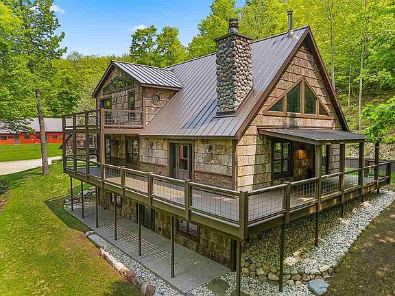 Escape to your Northern Michigan sanctuary nestled in the forest, where privacy meets panoramic views. This exquisite home showcases exceptional craftsmanship and attention to detail. This stunning property boasts 3,570 square feet of living space, with 3 bedrooms and 3 baths. Enjoy breathtaking sunset views from the wrap-around porch, complemented by Aspen bark clad siding that blends harmoniously with the landscape.  Outside, professional landscaping enhances the 20-acre estate, which includes a 4-car heated garage with a private guest suite featuring 1 bedroom, 1 bath, a kitchen, and dining area - perfect for guests or potential short term rental income. Additionally, a 30 x 72 foot heated pole building with an office provides ample space for hobbies or business endeavors.  Conveniently located a short drive from Petoskey, this retreat offers easy access to shopping and entertainment while preserving its secluded allure. Ideal for outdoor enthusiasts, summer brings proximity to Lake Michigan and nearby inland lakes for water sports, boating and fishing, while the surrounding forests and state land prove ideal for hiking, biking, ATV adventures, and hunting. In winter, enjoy access to premier Northern Michigan ski resorts and snowmobile trails via your private connection trail.  This property promises adventure, opportunity and serenity in the heart of Northern Michigan.