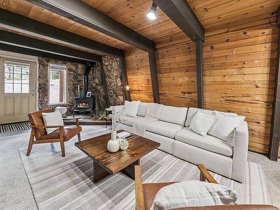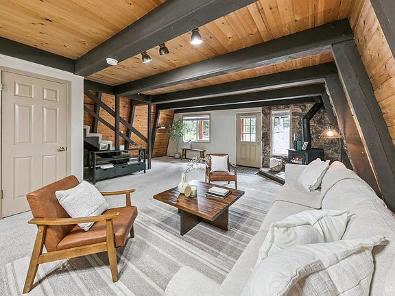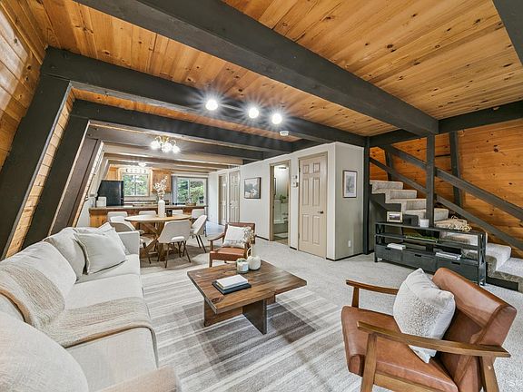 Discover this beautifully maintained gambrel style cabin in Christmas Valley! This charming three-bedroom, two-bathroom home offers 1,520 square feet of living space on an expansive 13,068 square foot lot with stunning views of Echo Summit.This property overlooks National Forest owned lots that ensure privacy and natural beauty.Step outside to enjoy direct access to the Upper Truckee River across the street, where National Forest land provides opportunities for recreation and relaxation.The downstairs living area features a great room with open beam ceilings, a cozy wood burning stove, and fresh carpet throughout. The updated kitchen features custom knotty alder cabinets, a gas range, and new luxury vinyl plank flooring.Upstairs, three bedrooms feature open beam ceilings and new carpeting. Other features include double pane vinyl frame windows, forced air heating, and a durable metal roof. The neighborhood location offers incredible convenience for outdoor enthusiasts, with miles of hiking and biking trails nearby including the renowned Tahoe Rim Trail just over a mile away.Winter sports lovers will appreciate the prime positioning between three renowned ski resorts. The Holiday Market provides easy access to daily necessities, making this mountain retreat both secluded and convenient for year-round living or vacation getaways.