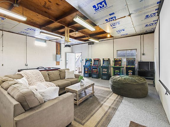 The lower level hosts a modern and fully equipped kitchen, perfect for preparing meals, and a spacious dining area for enjoying them with friends and family. Extra seating is available, including a love seat and an island with three stools. Start your mornings right with a well-equipped coffee bar, featuring a variety of coffee options to suit every taste, including K-Cups, drip ground coffee, and Nespresso (bring your own pods). The family room and sitting area on the main level are designed for relaxation and quality time with loved ones. Enjoy the ultimate entertainment hub in the heated garage, featuring arcade games, air hockey, ping pong, basketball, a custom bar, and a comfortable seating area with a projector.