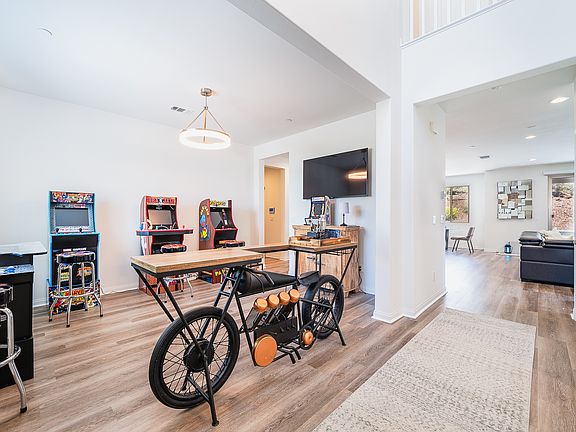 This home is your ultimate comfort zone. High ceilings and multiple doorways open up to a spacious floor plan, creating a bright and inviting atmosphere. With five bedrooms and four full bathrooms, it is large enough for a sizeable family. Our entertainment room boasts vintage arcade games and offers endless fun for all ages. The unique bicycle bar table adds a playful touch, perfect for casual drinks and lively conversations. The expansive, white kitchen is a culinary enthusiast's dream, featuring stainless steel appliances, a large central island, and a breakfast bar. From quick snacks to gourmet meals, this well-equipped space has you covered.