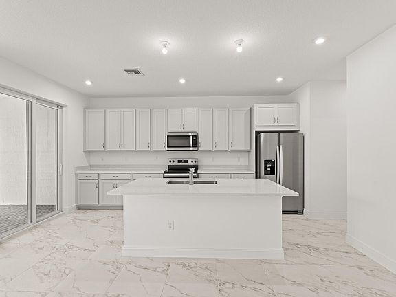 Porch in frontThree double windowsCabinetry lining the wallsCooking and counter spaceLarge kitchen