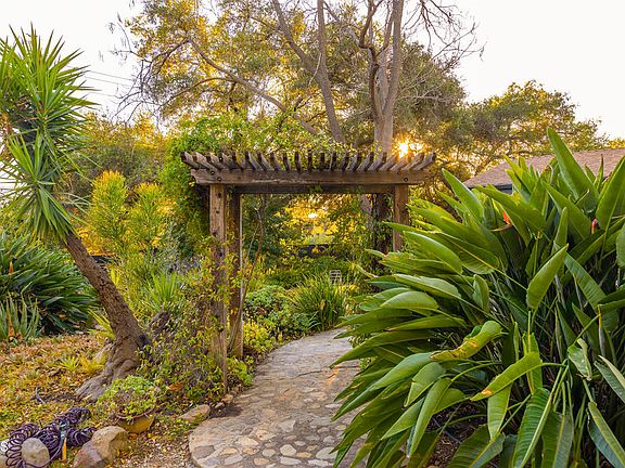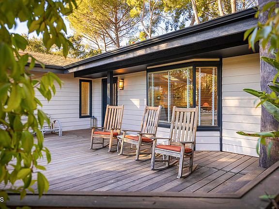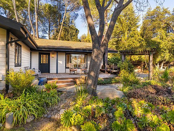 Nestled in Ojai's prestigious East End, this serene retreat blends old-world charm with modern luxury. Set on a sprawling .82-acre lot shaded by majestic mature oaks, this property offers unparalleled tranquility and privacy in a breathtaking natural setting. The completely updated 3br/2ba main residence has a clean, modern aesthetic, light and airy, with stylish lighting and finishes. There are wide plank wood floors and lovely views of the lush garden throughout. The beautiful modern kitchen has been fully renovated with high end appliances, marble countertops, a large island and custom cabinetry. It opens to the spacious living room with vaulted ceilings, a fireplace and a bay window with seat, which creates an integrated living space perfect for family and entertaining. The primary bedroom has high ceilings, clerestory windows, a sliding glass door leading outside. The other bedrooms have French doors that open directly to the garden. The modern bathrooms have been completely redone and are clean and spacious. A separate garage was converted into a large entertainment room with a large screen projector and built in surround sound speakers. It has high ceilings, cool lighting, and a mini split. A sliding glass wall allows it to open completely to the outside. It could also serve as a luxurious office or an artist studio. The fenced grounds are lush with trees and flowering plants and include a myriad of entertainment and lounging spaces. A brick patio with a large stone fireplace is perfect for al fresco dining under the stars. A beautiful lap pool surrounded by an spacious deck offer a beautiful space to read and take some sun. There are small covered porches off the bedrooms and a shady nook with a table for a quiet breakfast. Adding to the property's unique allure is the original 2br log cabin built in 1934 - a timeless guest house ideal for hosting visitors or serving as a quiet creative space. Rustic on the outside, it is clean and fresh on the inside, with new windows, a fireplace with a wood stove, and a full kitchen.
