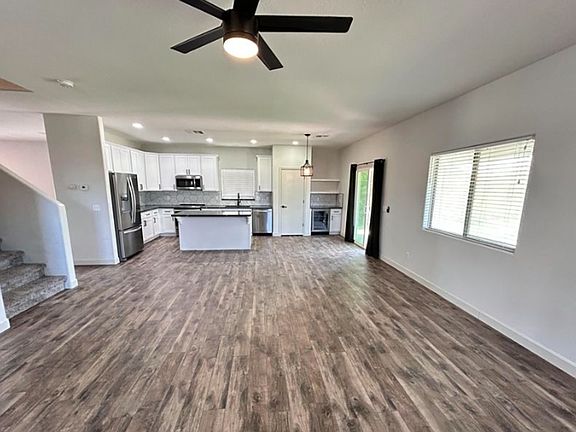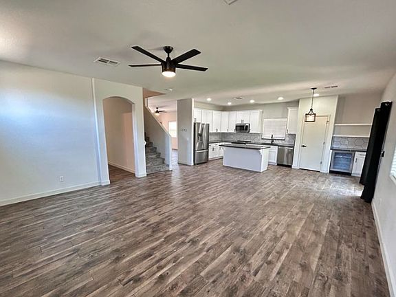 Move in Specials, $1500 off first months rent! This beautifully updated home blends modern comfort and contemporary finishes throughout! The spacious kitchen outfitted with sleek white cabinets, stainless steel appliances, a wine cooler, and elegant wood tile flooring that continues throughout the main living areas. High ceilings and a soothing modern color palette create an open, airy atmosphere, while the walk-in shower and large walk-in closets offer luxury and functionality in the private spaces. Step outside to enjoy the fully landscaped front and backyard, where mature trees provide shade and privacy. The backyard offers a cozy wood-fired pizza oven, a covered patio perfect for gatherings, and plenty of space to relax. Located in a welcoming community with lake, playground, walk/biking......