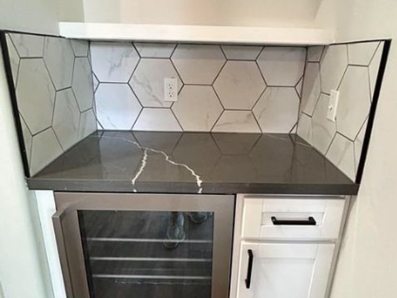 Covered patioHigh ceilingsMature treesModern color paletteWine coolerSleek white cabinetsCozy wood-fired pizza oven