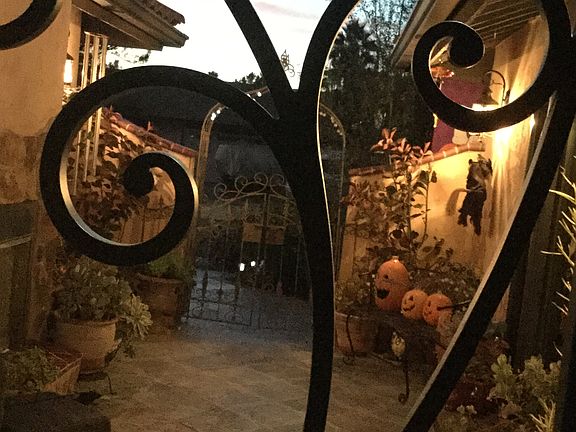 Enter from the gated courtyard, thru beautiful, iron double-doors, into living room with vaulted ceiling & soft arches; family-sized dining room; family room with cozy, gas fireplace; view into family room and into the dining room from kitchen. Living area is an open-space concept.