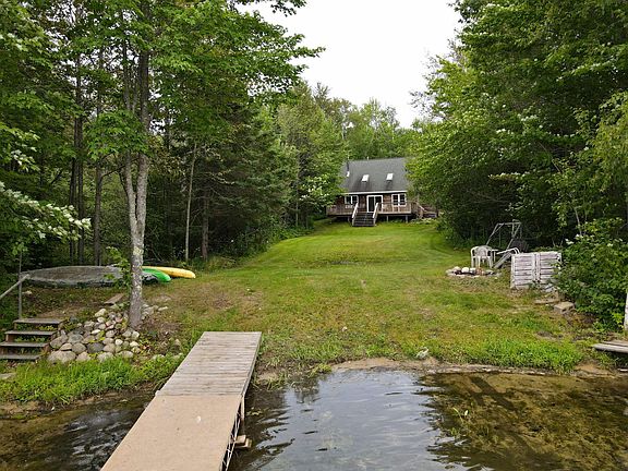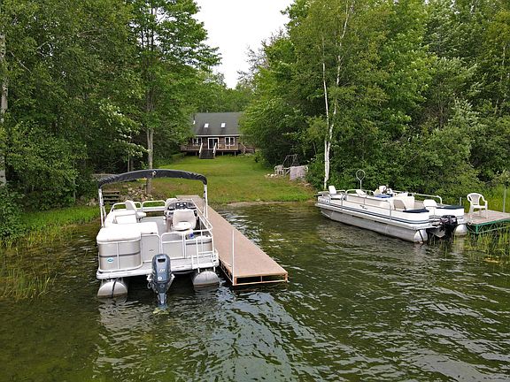 This is a private setting on a very nice level lot with 420' of sand shore on Little Wabana Lake. This three bedroom 1 ¾ bath home features vaulted ceilings with skylights in the living room, tongue and groove interior and wood burning fireplace, patio door to a large deck for entertaining. The kitchen is roomy with recessed lighting and lots of maple cabinets. Upper level features an open rail with two large bedrooms and recently remodeled ¾ bath. The 2 stall garage has a finished upper level for additional sleeping room.