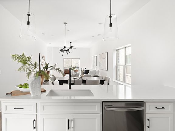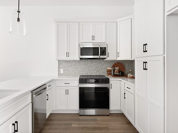 The chef’s kitchen is a true showstopper—featuring quartz countertops, a 9+ ft peninsula island, tile backsplash, custom-built soft-close cabinetry, and stainless steel appliances.